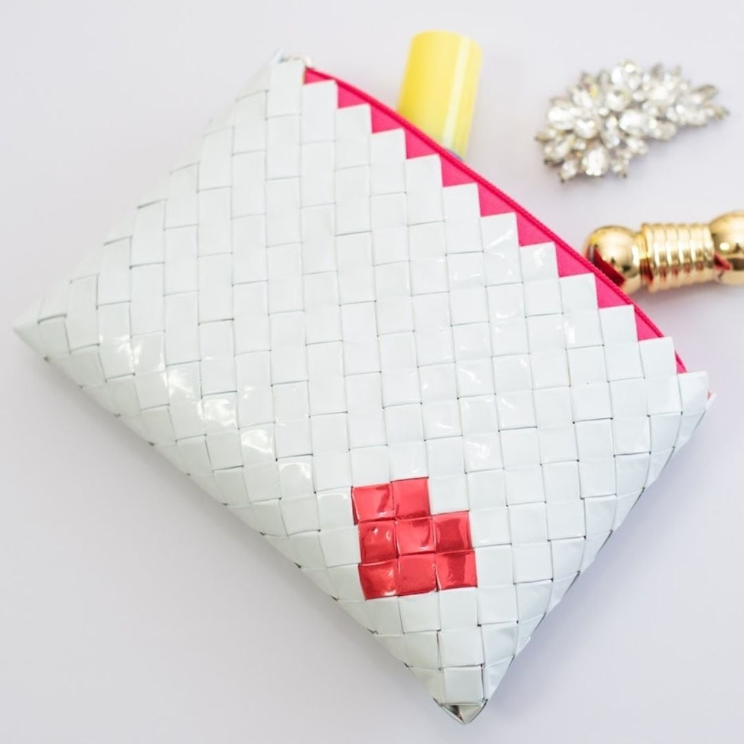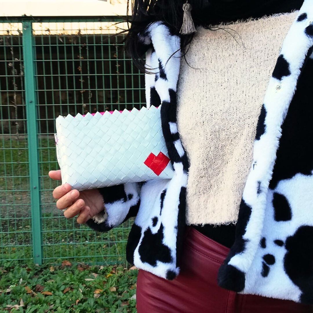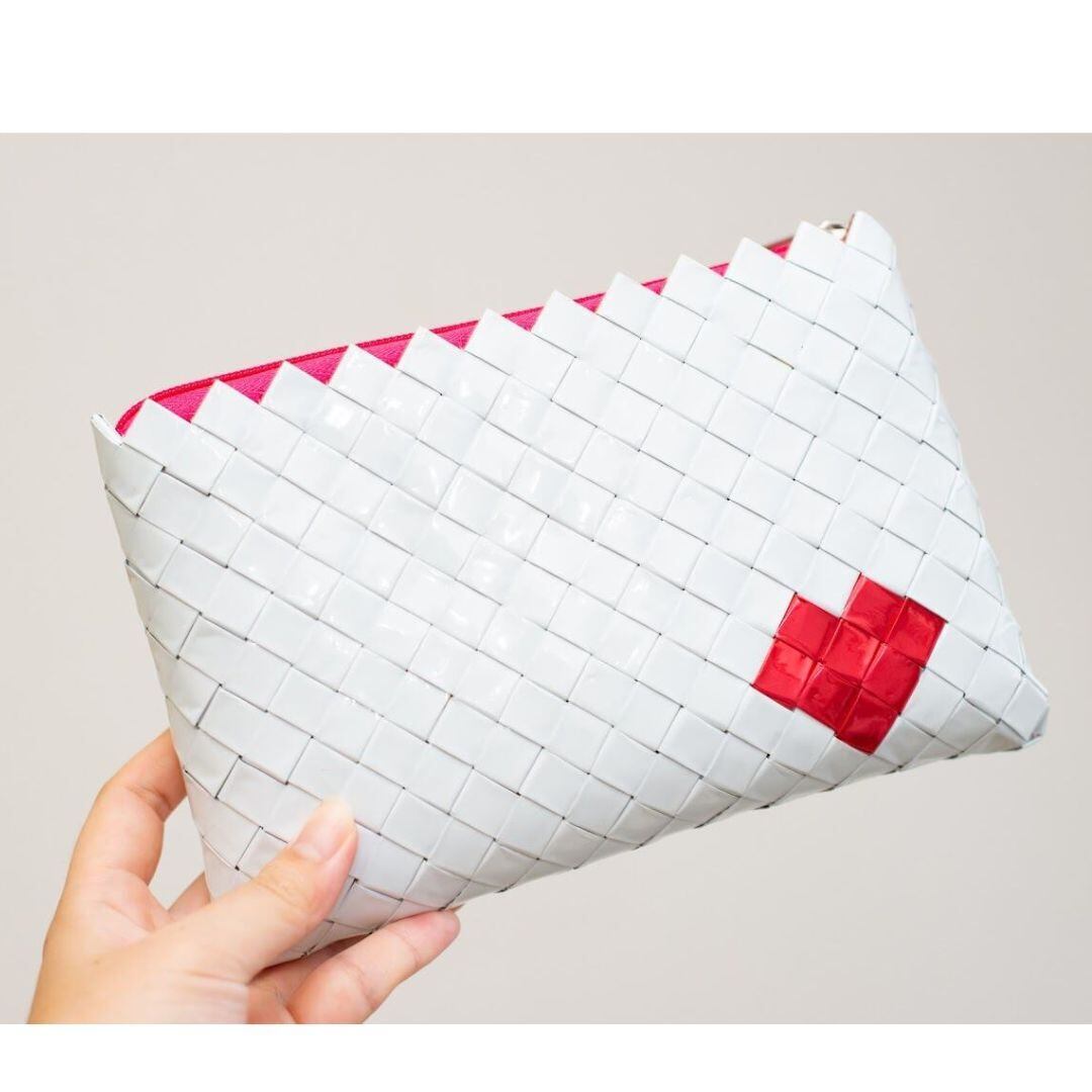 存在感も抜群、しっかりとしたハリとクッション性(アルミシートを折り紙のように折り畳んでつないだピースからクッション性がうまれています)のある大きめポーチは、ファッションのアクセントに♪