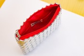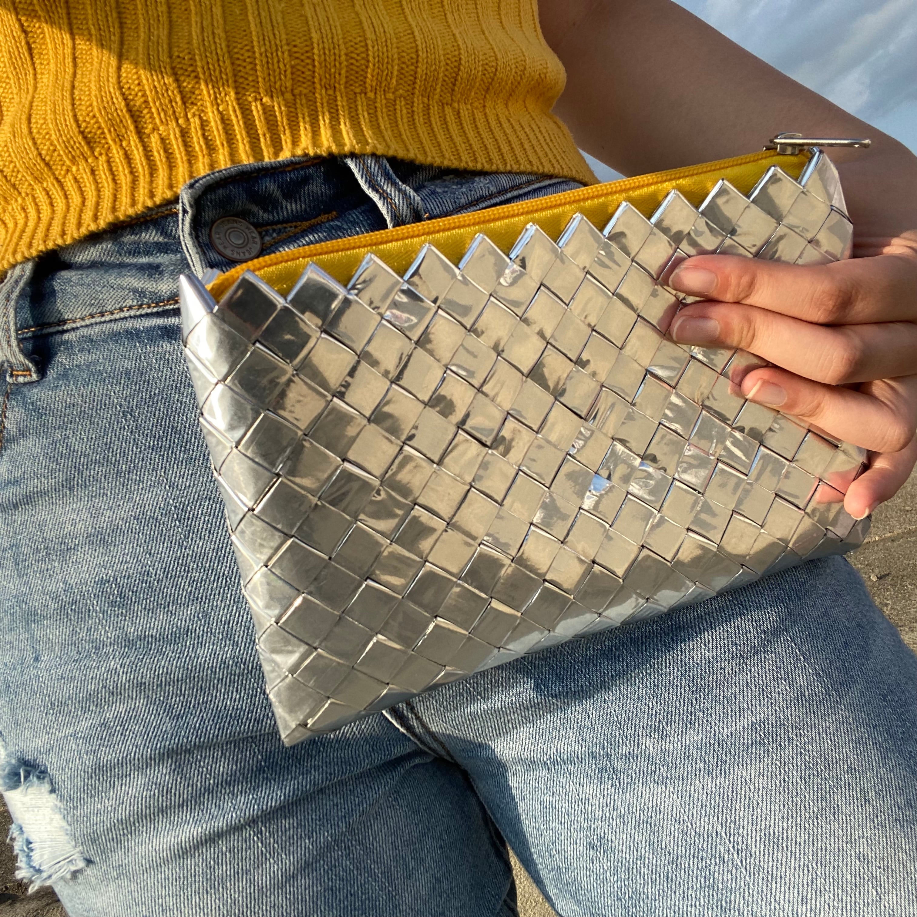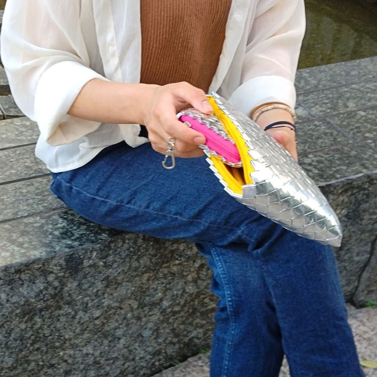 存在感も抜群、しっかりとしたハリとクッション性(アルミシートを折り紙のように折り畳んでつないだピースからクッション性がうまれています)のある大きめポーチは、ファッションのアクセントに♪